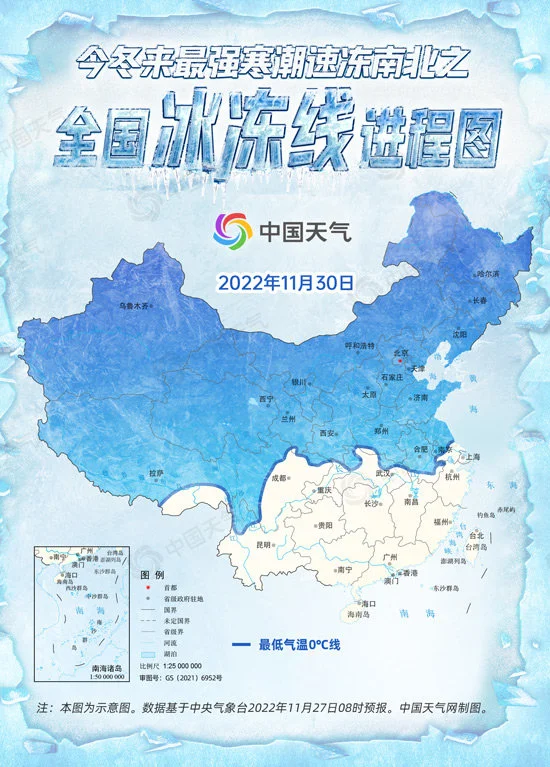 中国天气网讯 爆冷的不只是世界杯,还有正在影响我国的今冬来最强寒潮天气。11月27日至12月1日,中东部大部地区气温暴跌,局地降温超20℃,0℃线将抵达长江中下游一带,我国超20省区市将被寒潮速冻。中国天气网推出全国冰冻线进程图,看你家何时被“冰冻”。