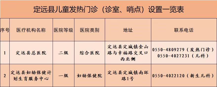 2022年12月7日国家疫情防控新十条颁布后,为了保障人民群众生命安全,保障孕产妇和儿童等弱势群体医疗救治,定远县分别在县总医院、县妇计中心设置了儿童发热门诊,保障发热儿童及时就医。现将定远县儿童发热门诊名单以及县总医院、县妇计中心住院部儿科联系电话进行公示。