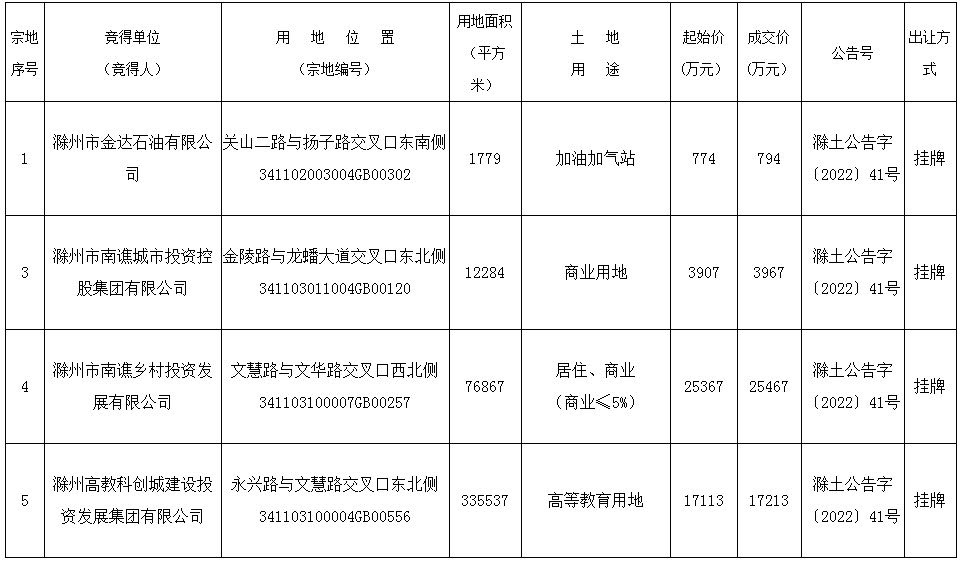 滁州市2022年国有建设用地出让成交结果公告41号(挂牌)