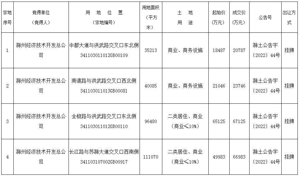 滁州市2022年国有建设用地出让成交结果公告44号(挂牌)