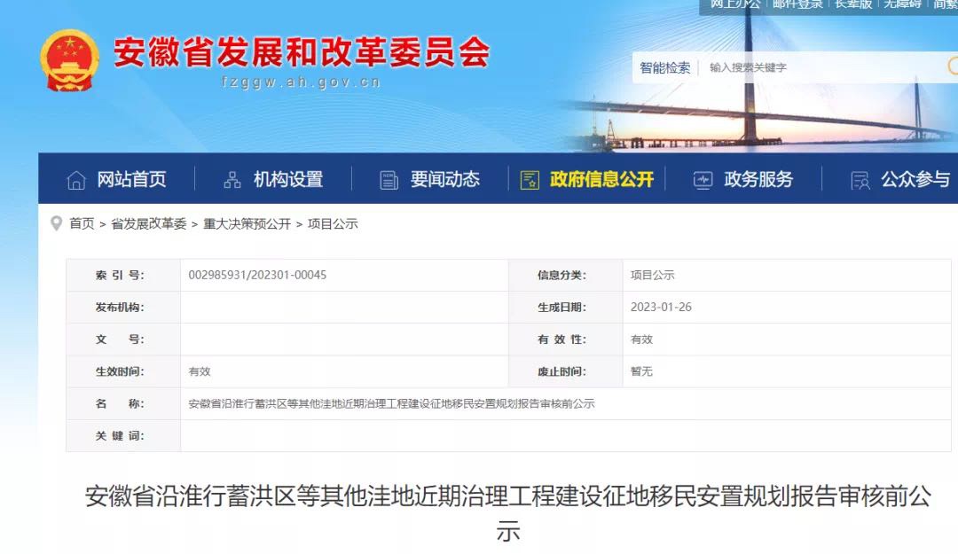 近日,安徽省沿淮行蓄洪区等其他洼地近期治理工程建设征地移民安置规划报告审核前公示在省发改委网公示。
