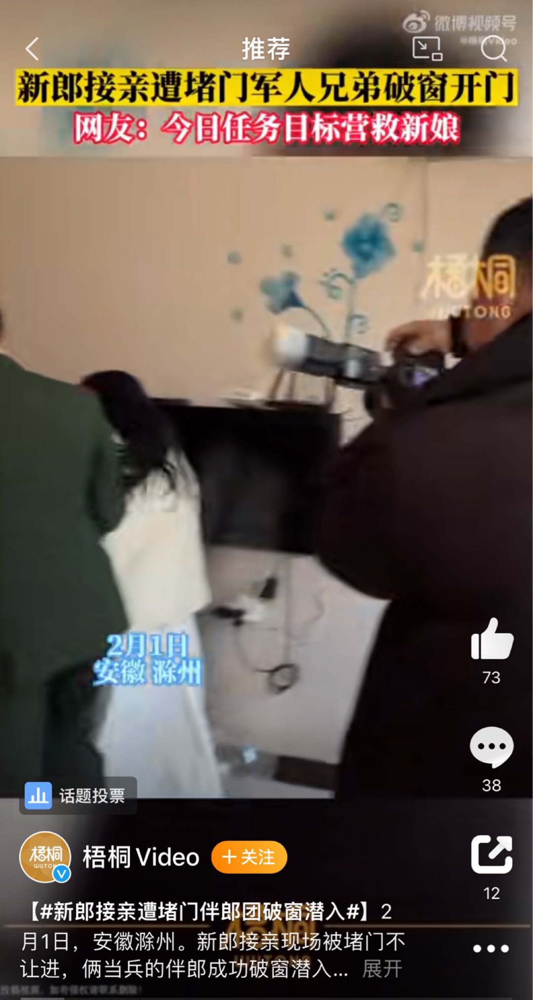2月1日,安徽滁州。新郎接亲现场被堵门不让进,俩当兵的伴郎成功破窗潜入打开房门。拍摄者代女士称新郎准备撞开房门被新娘阻止,结果窗子突然被打开跳进两个人,站窗边的自己当时都快被吓死了。