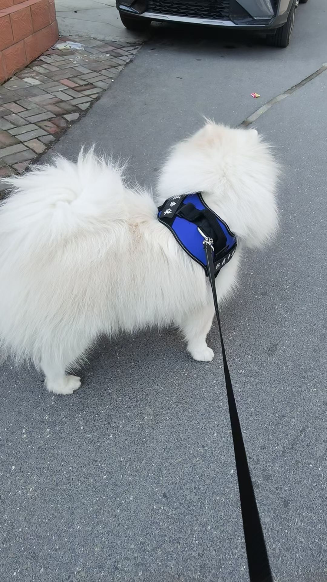 详细描述:法斗脸部是对称黑色,身上白色有一点黑色斑,身上有暗红色细背带。萨摩耶身上有蓝黑色宽背带,背带两边有字。