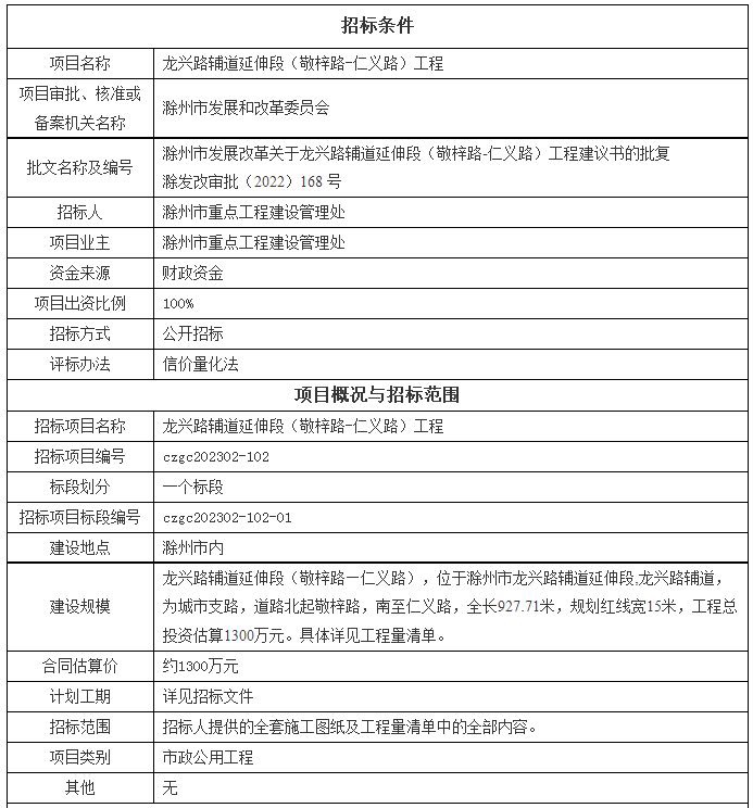 建设规模:龙兴路辅道延伸段(敬梓路—仁义路),位于滁州市龙兴路辅道延伸段,龙兴路辅道,为城市支路,道路北起敬梓路,南至仁义路,全长927.71米,规划红线宽15米,工程总投资估算1300万元。