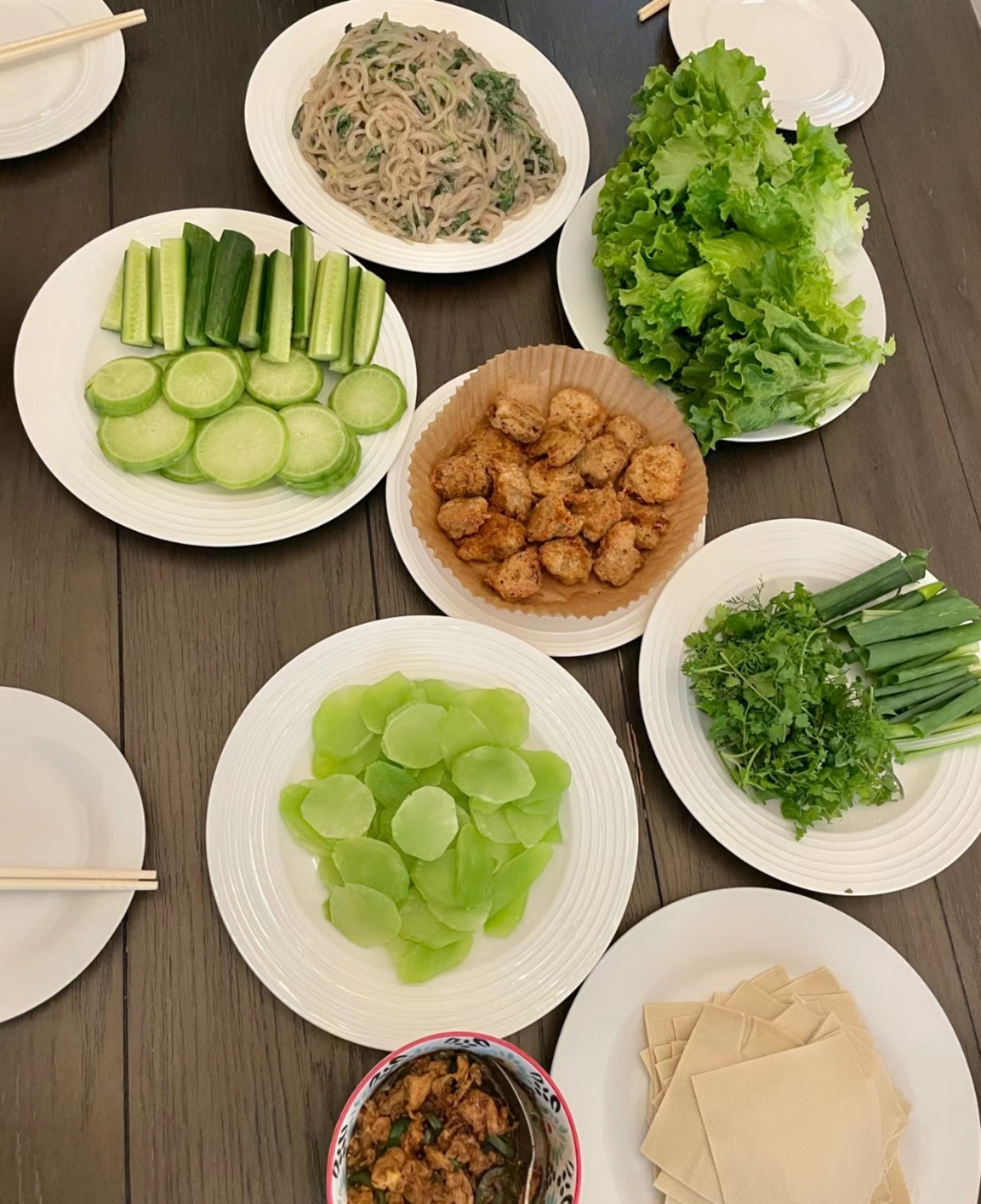 喊了两个朋友来吃饭,做了个清拌芦笋,蘸酱菜:配菜有生菜,萝卜,黄瓜,青葱香菜,豆腐皮,还有个菠菜拌粉条,香烤素食版小酥肉。结果朋友一直问我是不是有什么事,是这几个菜有什么问题吗?