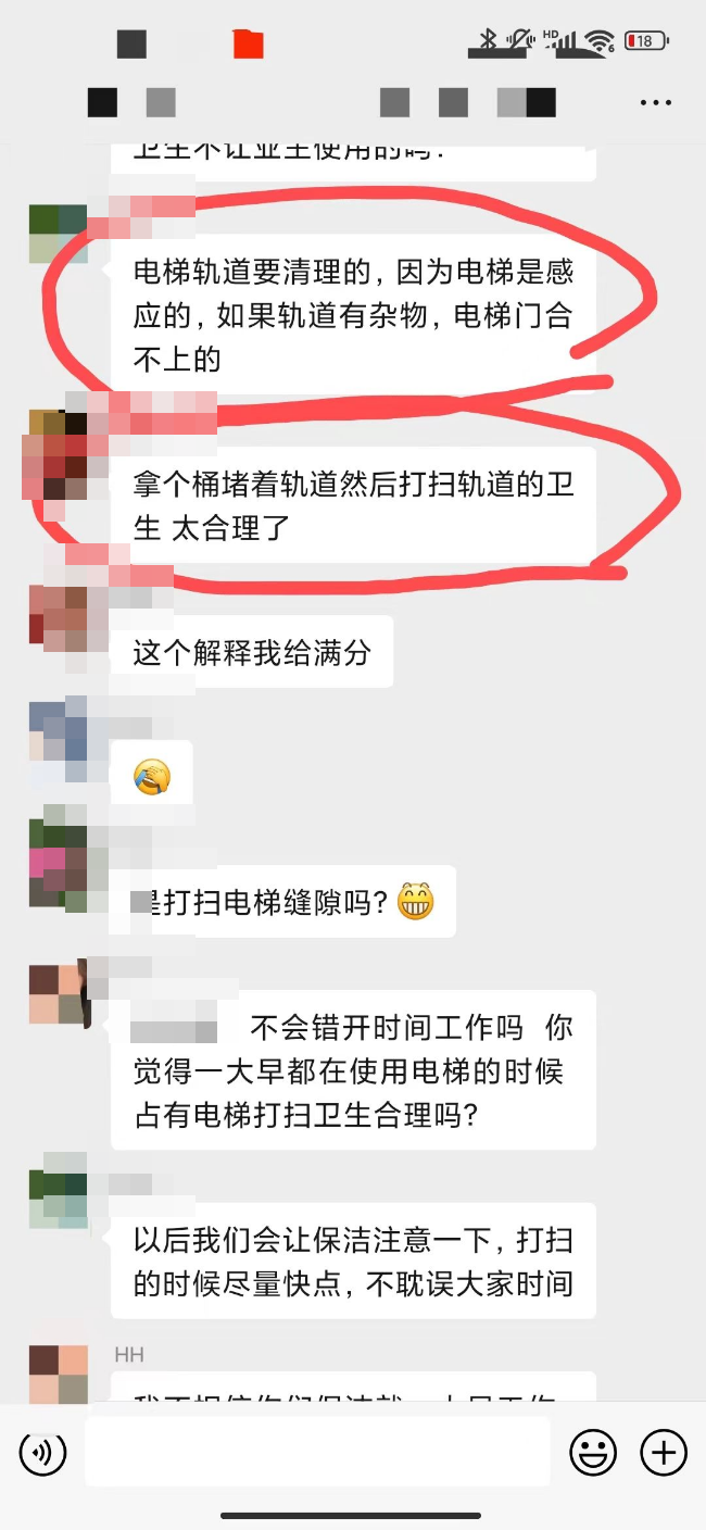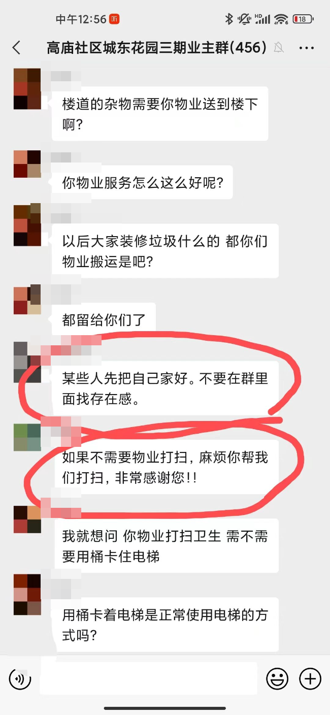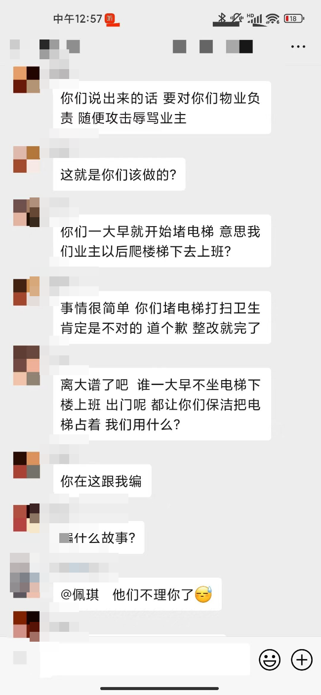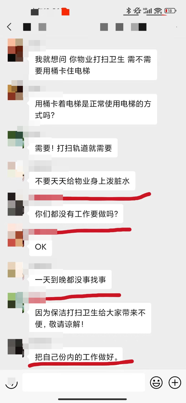 在群内反应问题时,物业对业主进行辱骂攻击,真的对得起这三级物业的收费标准和服务水平!早高峰拿个桶堵着电梯说是在打扫卫生,影响小孩上学工人工作还不让大家说,说堵着电梯是为了打扫轨道,拿着桶堵着轨道打扫轨道,这逻辑鬼才!坐着电梯打扫卫生!!!绝了!楼顶的那两坨,从交房到现在两个月了也没有清理,不知道的还以为物业公司多么爱护公共区域的卫生