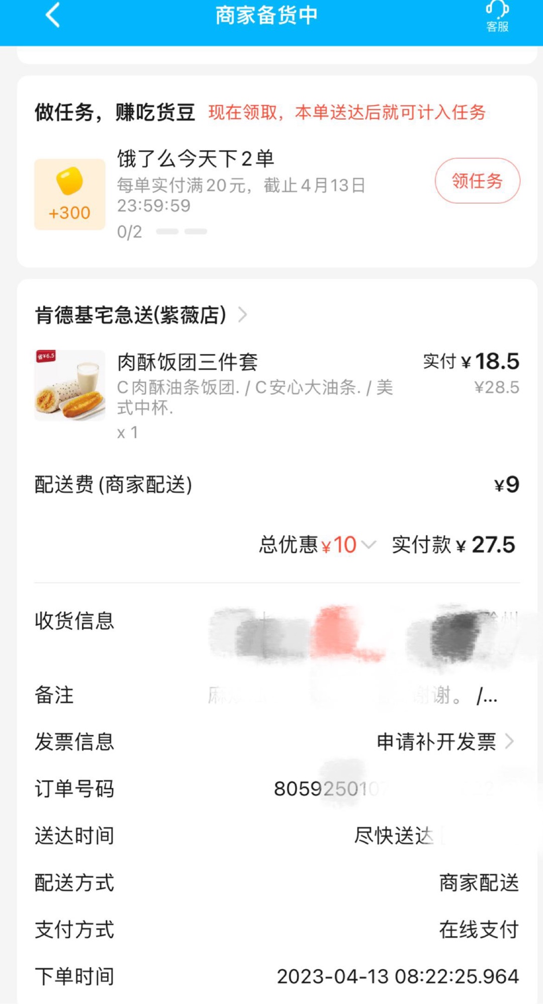 相比于麦当劳,我还是很喜欢吃肯德基,早上没吃饱,又点了一份肯德基早餐,但是配送费需要9块钱,真的很心疼,那我也要点它!其他店的早餐都不想吃