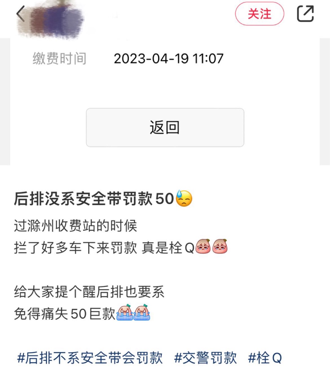 刷小红书看到的,后排要求系安全带了吗?这个人说是在过滁州收费站被罚了50块钱,这太狠了吧,如果是第一次警醒一下骂几句不就得了,之后要犯再罚钱吧