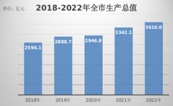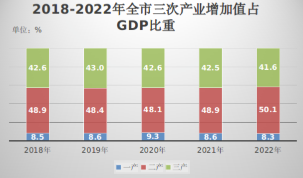 初步测算,全年实现生产总值(GDP)[2]3610.0亿元, 按可比价格计算,同比增长5.5%。其中,第一产业增加值301.5亿元,增长3.7%;第二产业增加值1808.0亿元,增长7.7%;第三产业增加值1500.5亿元,增长3.5%[3]。三次产业结构调整为8.3:50.1:41.6,其中工业增加值占GDP的比重为40.1%。按常住人口计算,人均地区生产总值89800元(折合13351美元),比上年增长4.8%。