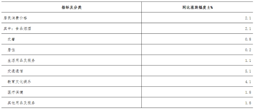 全年城镇新增就业13.42万人,失业人员再就业1.48万人。全年居民消费价格累计上涨2.1%,涨幅高于上年1.1个百分点。从构成类别看,八大类商品和服务价格全部上涨。其中,交通通信价格上涨5.1%,教育文化娱乐价格上涨4.1%,食品烟酒价格上涨2.1%,医疗保健价格上涨1.8%,其他用品及服务价格上涨1.8%,生活用品及服务价格上涨1.1%,衣着价格上涨0.8%,居住价格上涨0.2%。