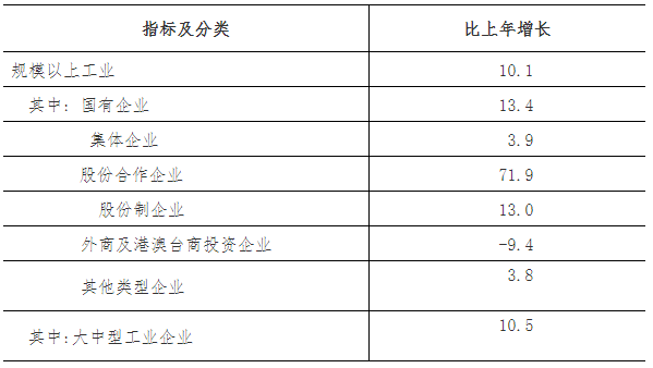 全年规模以上工业增加值[4]比上年增长10.1%。在规模以上工业中股份合作企业、国有企业增长较快,增速分别为71.9%、13.4%。