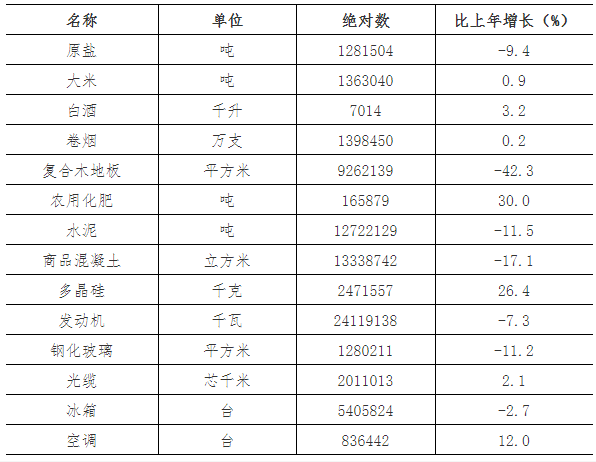 主要工业产品产量方面,农用化肥16.6万吨,增长30.0%;多晶硅2471.6吨,增长26.4%;空调83.6万台,增长12.0%;白酒701.4万升,增长3.2%;光缆201.1万芯千米,增长2.1%。