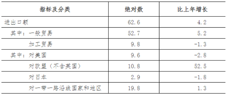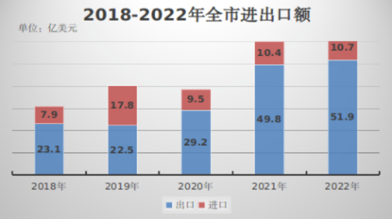 全年进出口62.6亿美元,比上年增长4.2%,其中出口总额51.9亿美元,增长4.3%,进口总额10.7亿美元,增长3.4 %。从进出口经营主体看,内资生产企业完成49.1亿美元,增长2.5%;外商投资企业完成13.6亿美元,增长10.2%。