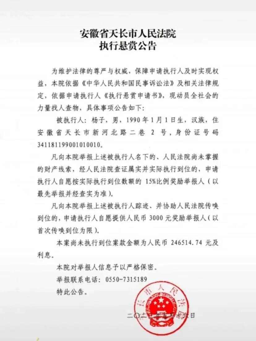 为切实保护债权人的合法权益,加强信用机制建设,打击被执行人逃避执行的行为,现经申请执行人申请,依据《中华人民共和国民事诉讼法》第262条、《最高人民法院关于民事执行中财产调查的若干问题的规定》第22条规定,天长市人民法院决定发布执行悬赏公告,对案件中的被执行人下落和财产提供线索者予以奖励。天长市人民法院郑重承诺:对提供线索的单位和个人信息依法予以保密!举报电话:0550-7315189联系人:徐法官