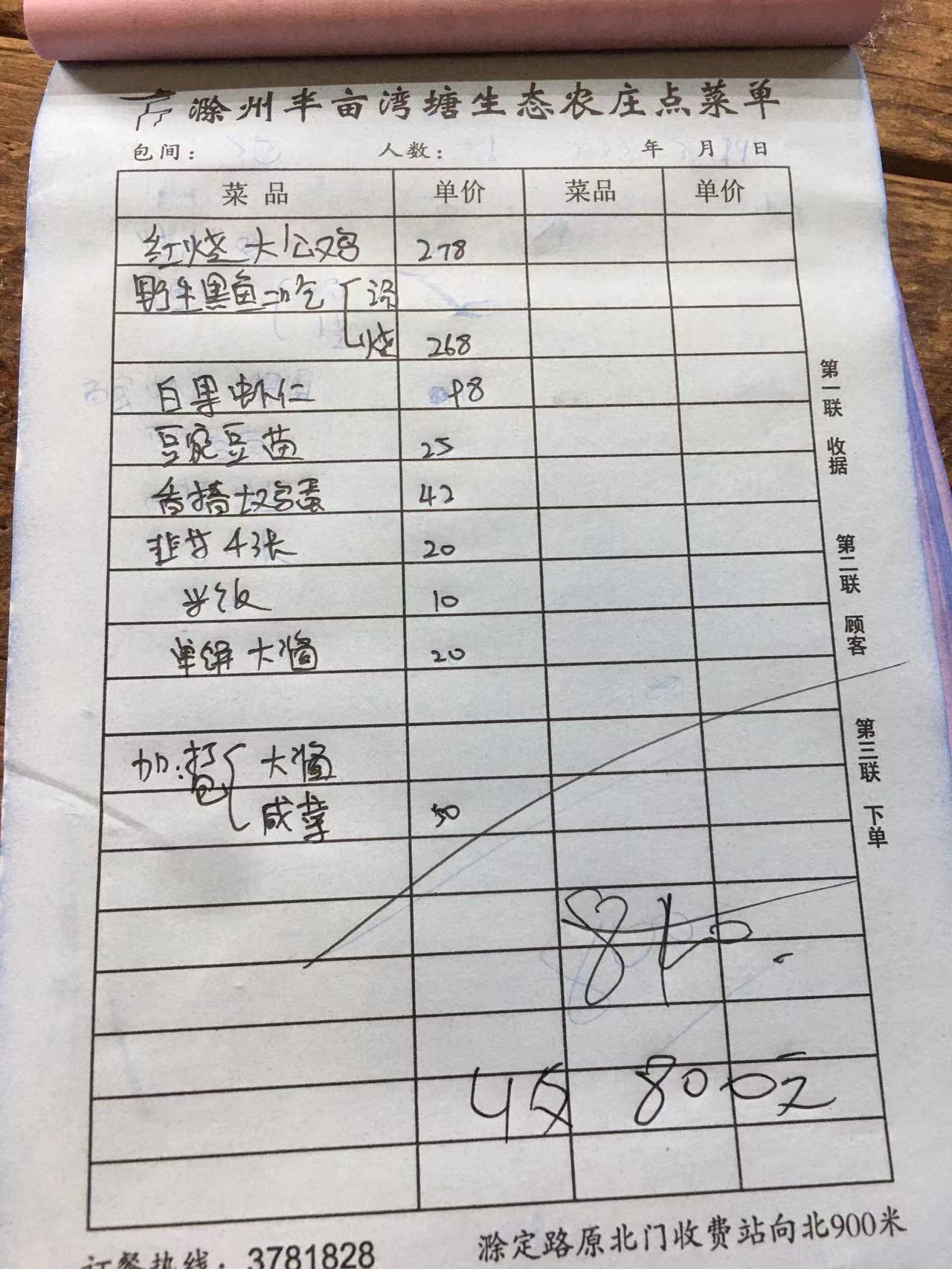 分享3月20日在滁州半亩湾塘农家乐的午餐清单! 点菜没有价格单,结帐时给一个大惊喜! 烧一只公鸡278元! 提醒广大e友节假日出行消费一定要先看价格单!