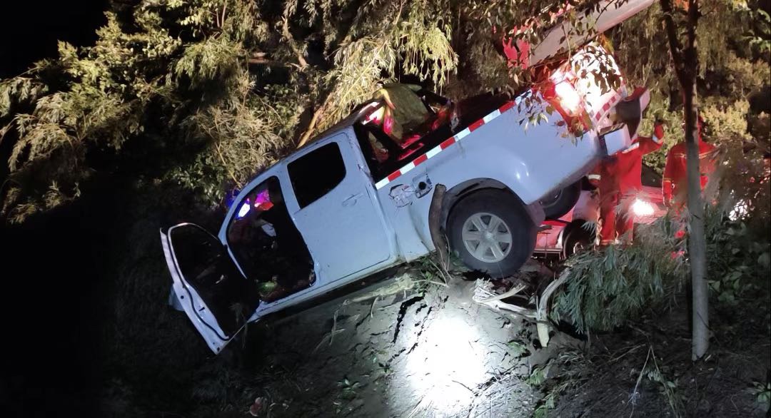 消防救援人员到达现场,经现场勘询,一辆白色皮卡车斜在马路边,车头部位悬空,驾驶员被困车内,不得动弹,救援人员立即展开施救。