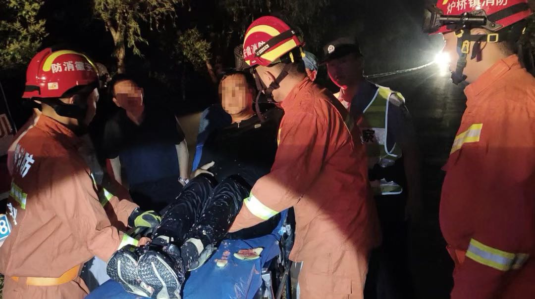 消防人员将被困人员抱上担架,移交给现场医护人员进行下一步救治。