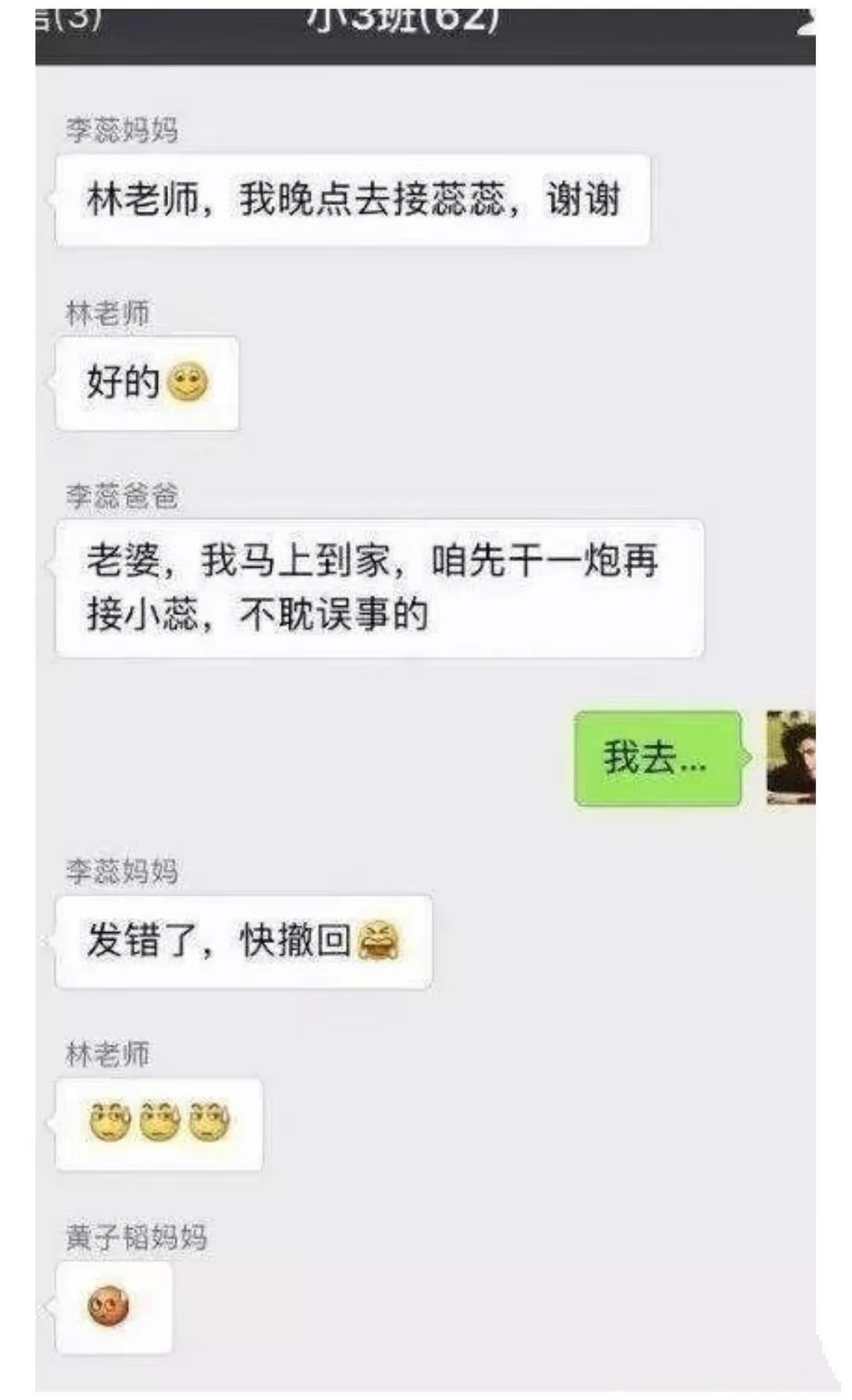 今天朋友给我截图看了一个笑话,他家二宝班级群里前些天,一位家长错发了信息,应该是私发给他老婆的,结果错发到群里了。以后发信息可都注意点啊!你说这家长以后去接孩子得多尴尬啊,以后还咋见老师!听说孩子外婆也在群里
