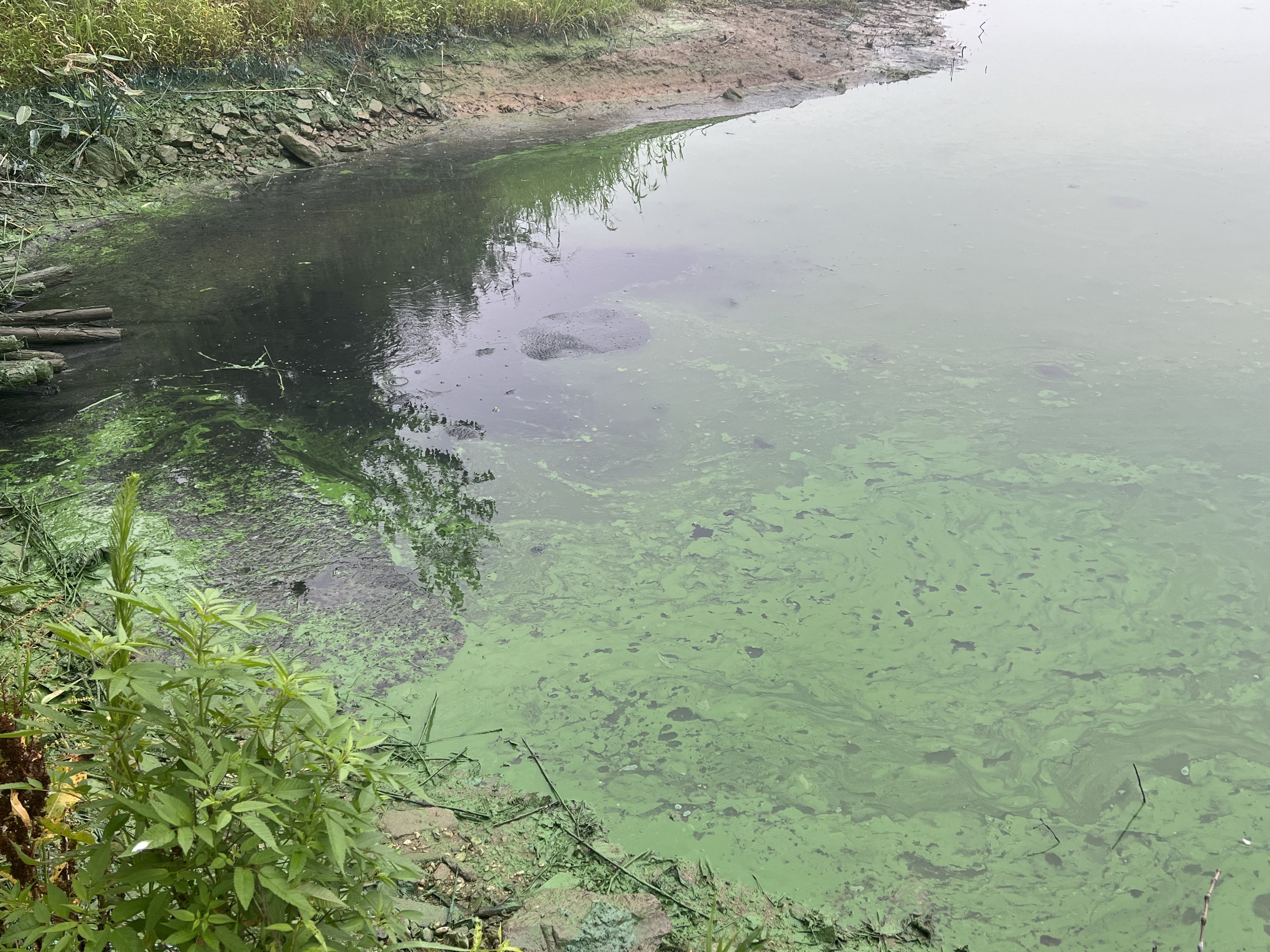 绿色的染料在水面大面积铺开,由于天气干燥,原有的水位已经下降许多,下降的位置已然是被染料染成了鲜绿色,与旁边盛夏的深绿色草丛形成鲜明的对比。