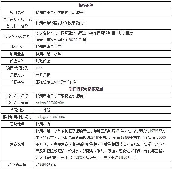 滁州市第二小学东校区新建项目位于琅琊区凤凰路371号,总占地面积约19795平方米(约30亩),规划总建筑面积约23449平方米(新建18499平方米,保留面积5000平方米),主要建设内容包括1#教学楼、3#教学楼图书馆、游泳馆、食堂、地下车库及配套建设道路、给排水、供配电、消防、暖通、智能化、环保、绿化等工程,为设计采购施工一体化(EPC)建设项目,总投资约14900万元。