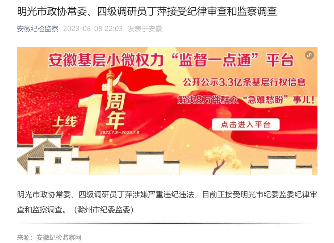 据滁州市纪委监委消息:明光市政协常委、四级调研员丁萍涉嫌严重违纪违法,目前正接受明光市纪委监委纪律审查和监察调查。