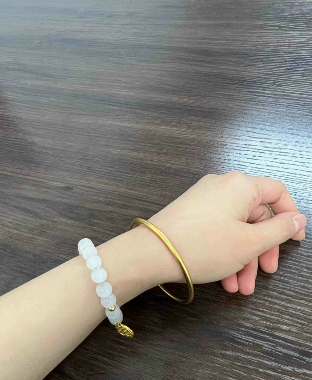 今天来上班,几个同事看到了我戴的新手镯,七嘴八舌的议论,有个同事一直说我这个太细了,不好看,是酸吗?