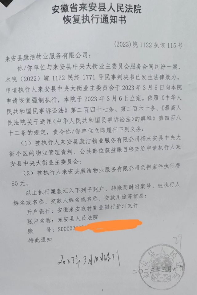 2022年12月7日,申请执行人去来安县人民法院立案庭索要案件受理通知书时发现,该案已被作结案处理。申请执行人立即与该案法官联系,至2022年12月9日收到案件受理通知书、结案证明。经无数次交涉,于2023年2月3日向该案执行法官提交《关于被申请执行人来安县康洁物业服务有限公司未移交资料情况说明》,并提供滁州市海恒物业管理有限公司移交给申请执行人的公共部位获益账目票据、银行流水样本,用于执行法官参照、强制康洁物业移交,2023年3月10日收到(2023)皖1122执恢115号恢复执行通知书。