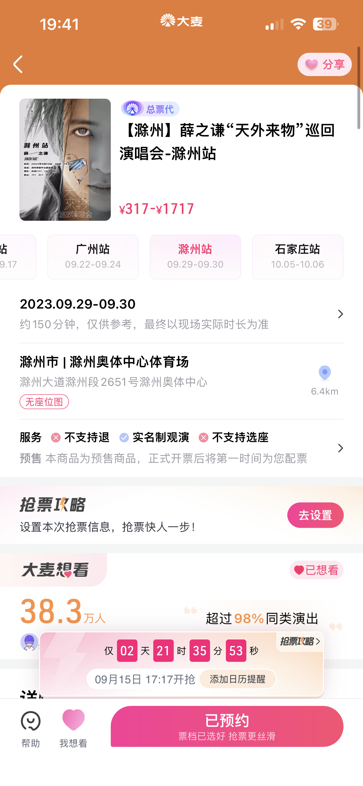 定了!薛之谦“天外来物”巡回演唱会-滁州站将于9 月 15 日 17:17正式开售!