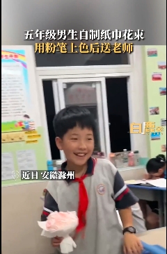 【#五年级男生自制彩色纸巾花束送老师# 班主任:是用粉笔给纸巾花束上色的】近日,安徽滁州。五年级男生自制纸巾花束用粉笔上色后送老师。班主任谷老师称,这个男孩整天都在做这个花,自己一直都没发现。