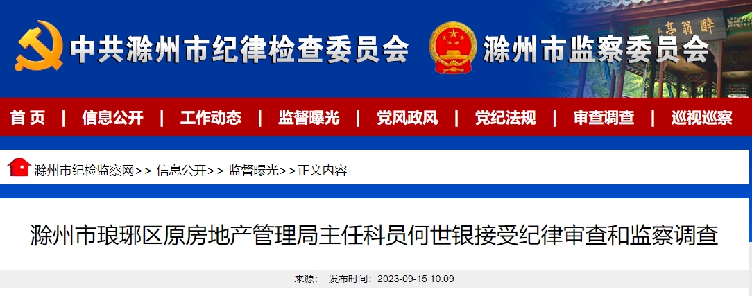 滁州市琅琊区原房地产管理局主任科员何世银涉嫌严重违纪违法,目前正接受滁州市琅琊区纪委监委纪律审查和监察调查。(滁州市纪委监委)
