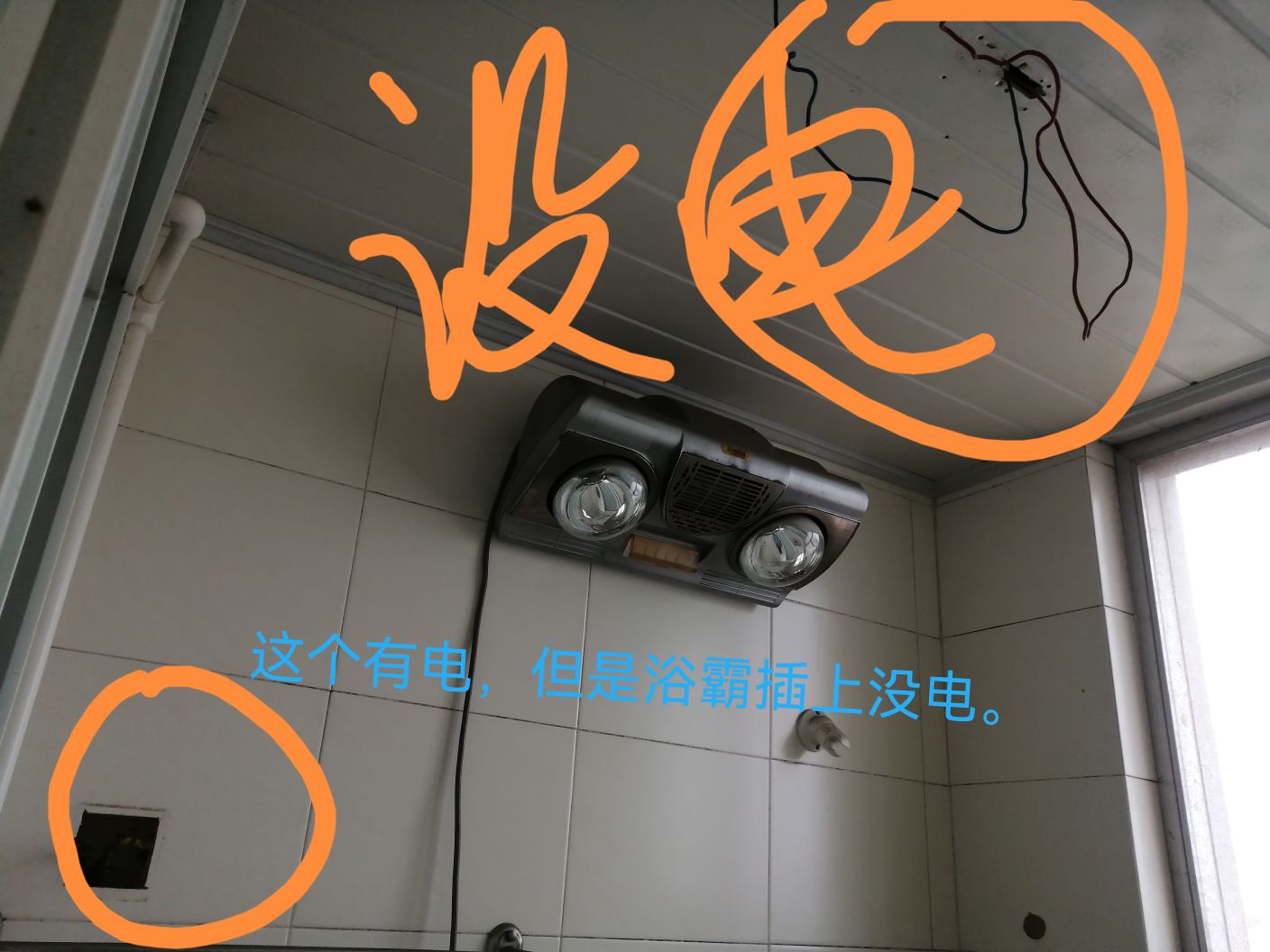 这个房子突然发现浴霸没电,卫生间的顶灯不亮,开关没有电。厨房间的油烟机没有电。插浴霸的五孔插座有一根线有电,插上浴霸还是没电?请教这是什么问题,谢谢!房间有电,卧室有电厨房的,冰箱有电。总线盒的几个开关都有电。