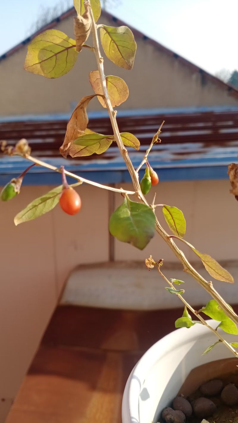 移植的枸杞,刚开始一年植入盆中像挂了一样,连个叶子都没发。重新栽回地里一年回转了青春,去年年底又重新植回盆中好生照料。春天抽了芽,夏末之际开了小紫花。现在零零散散结了几颗枸杞,还有几颗开始泛红了。不枉我三年的培育,或许它真的能感受到我对她的关爱吧。用这种方式来回应我。