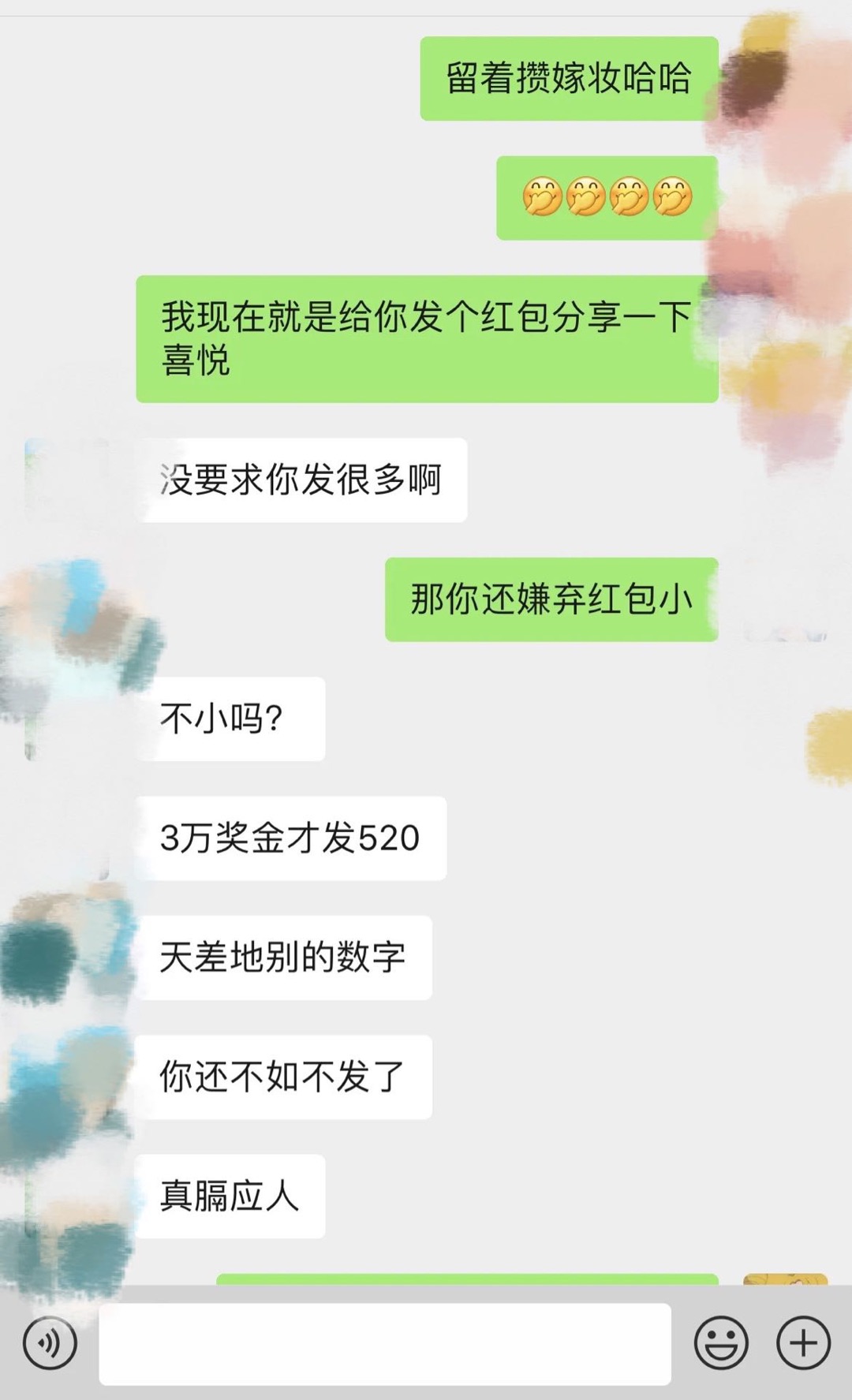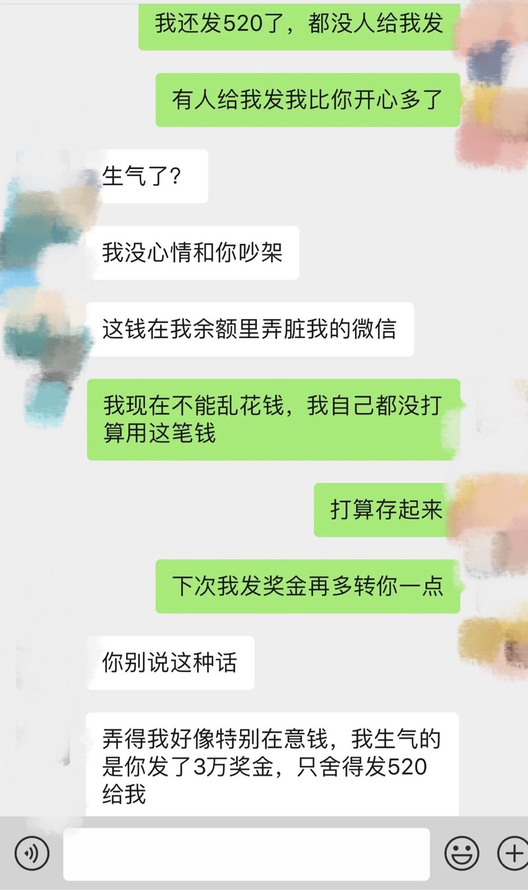 跟了两个多月终于开单了,赚到了3W块钱,我就想把这事和我男朋友分享一下,顺便发个小红包分享喜悦,他却嫌太少了还说我这钱恶心弄脏了他的微信钱包,就很伤心,我不过是想分享一下我的喜悦而已,他怎么这个样子