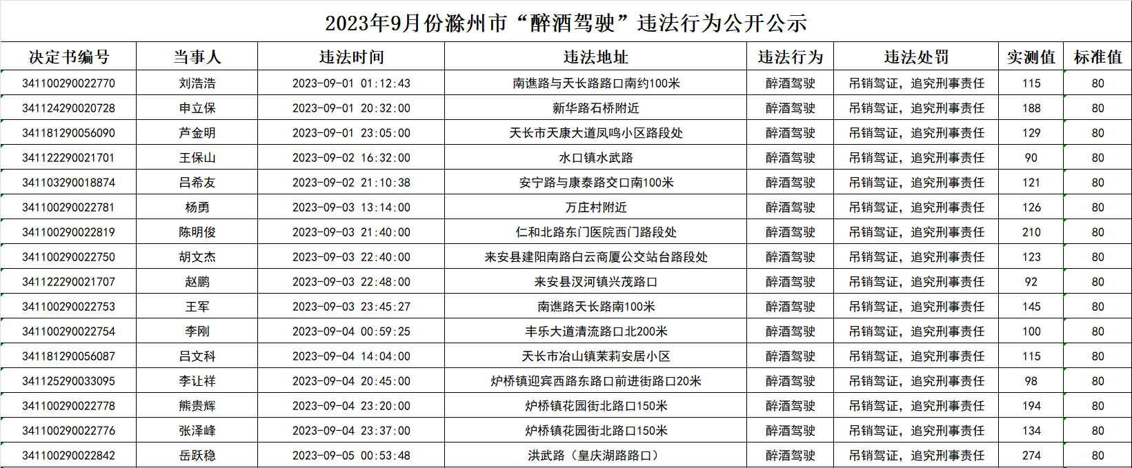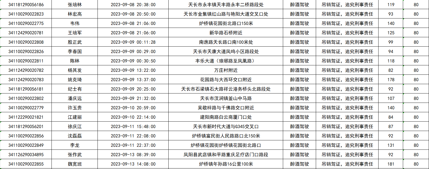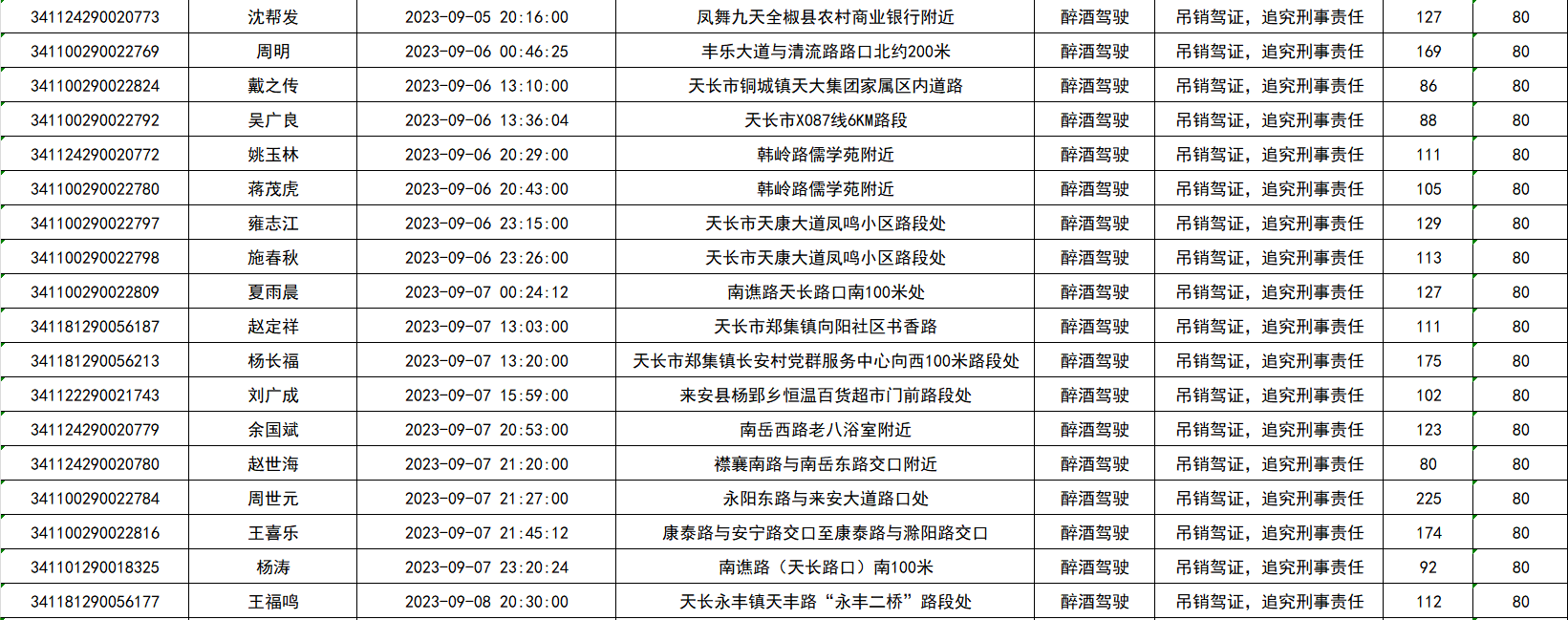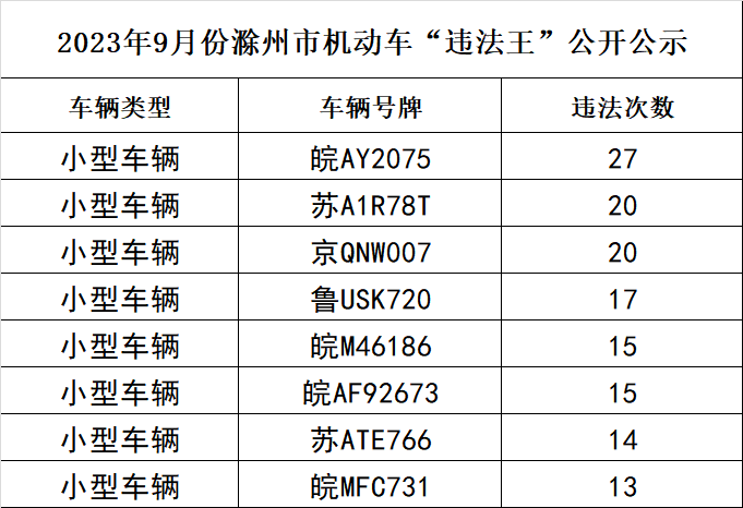 为做好交通事故预防“减量控大”(减少事故起数,控制较大交通事故)行动安全警示教育,进一步提高广大道路交通参与人员的交通安全意识、法治意识、文明意识,预防和减少交通事故,保障广大群众生命财产安全,滁州公安交警部门持续开展交通违法“五大曝光”(典型案例、终生禁驾、醉酒驾驶、机动车“违法王”、涉牌涉证违法、高风险运输企业)行动。现将2023年9月份滁州市终生禁驾、严重交通违法等交通违法“五大曝光”部分内容公示如下:7座面包车塞了17人!交警灵魂发问:你们出事了,子女疼不疼?天长市公安交警,在交通违法整治过程中,发现一辆蓝牌面包车存在涉嫌超员的违法行为。经现场检查,该普通客车竟然装了17人!行驶证注明核载7人,实载17人,超员达143%!交警对乘车人进行了“苦口婆心”式的批评教育,并对驾驶员依法处以罚款200元,驾驶证记12分的处罚。