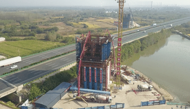 跨沪陕高速公路特大桥共两个主墩,分别是622号墩和621号墩,当日622号墩0#块顺利浇筑,其梁体采用变高度变截面单箱双室直腹板箱梁,索塔位置梁面宽18.9米,其他区段梁面顶宽14.4米,底宽12米0号块中支点梁高11米,端部高10.63米,长度16米,设计方量1569立方米,0#块浇筑完成标志着沪宁合高铁跨沪陕高速公路特大桥上部结构施工正式开始。