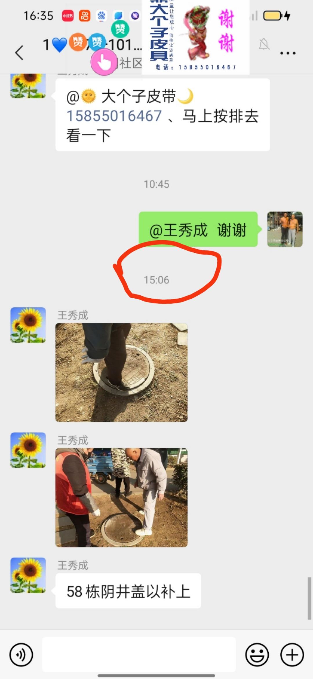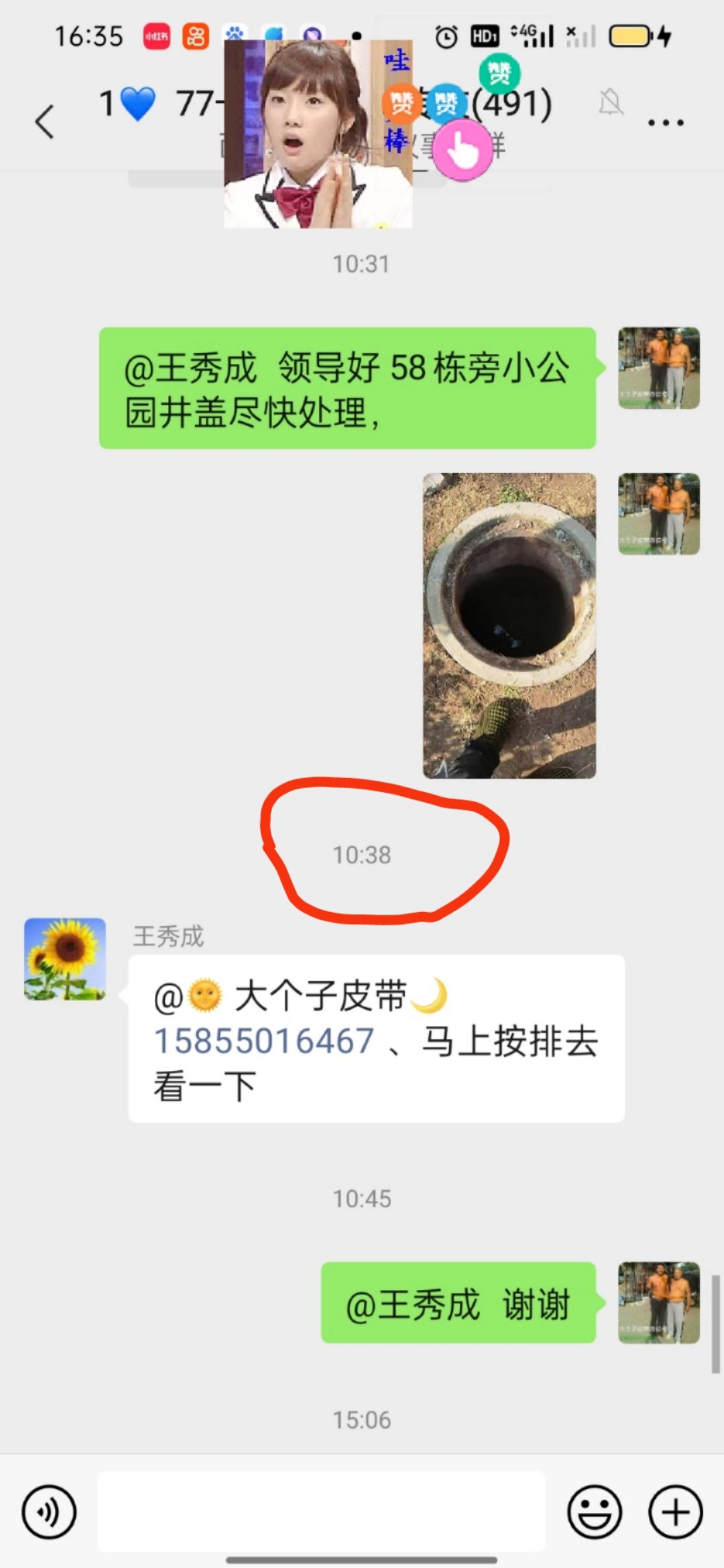 西涧花园小区 58栋窨井盖缺失报修5个小时内极速维修井盖赢得西涧花园小区业主点赞
