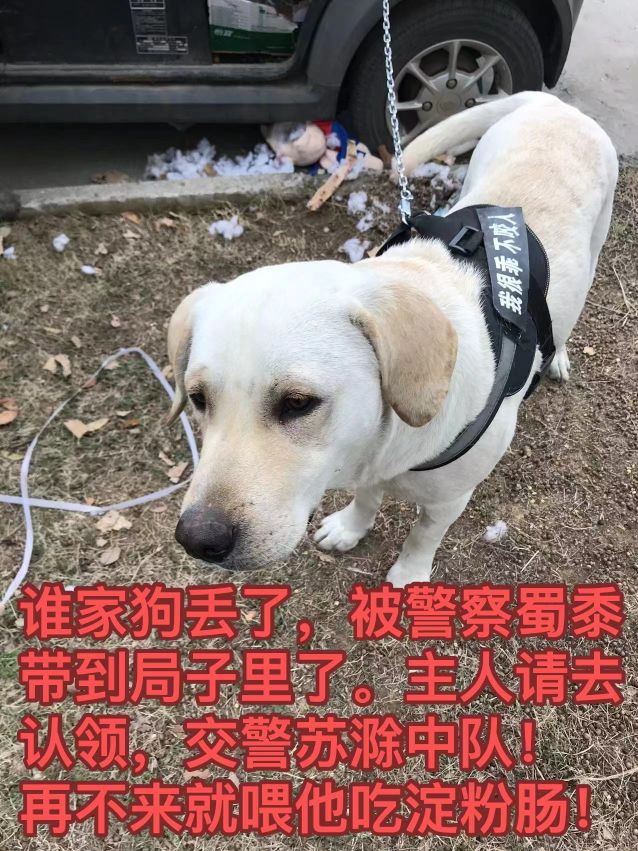 谁家狗丢了,被警察蜀黍带到局子里了。主人请去认领,交警苏滁中队!再不来就喂他吃淀粉肠!