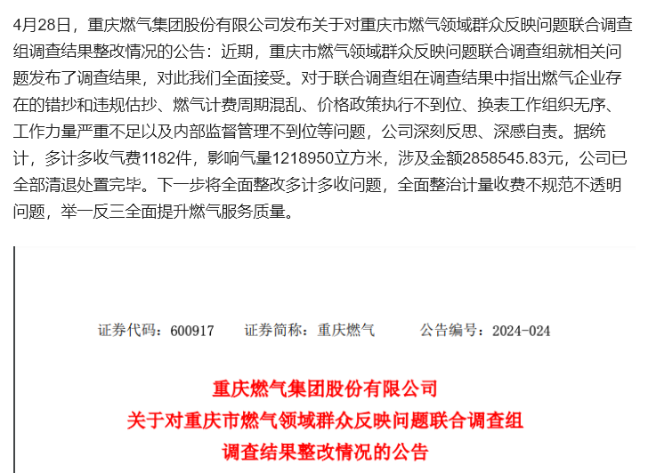 重庆的检查结果出来了, 据统计,多计多收气费1182件,影响气量1218950立方米,涉及金额2858545.83元,公司已全部清退处置完毕。