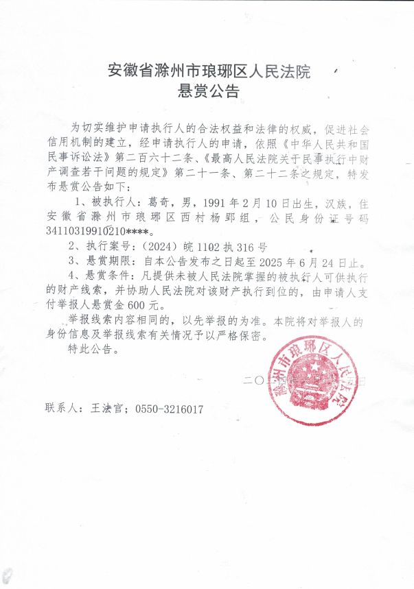 1、被执行人:葛奇,男,1991 年 2 月 10 日出生,汉族,住安徽省滁州市琅琊区西村杨郢组,公民身份证号码 34110319910210****。