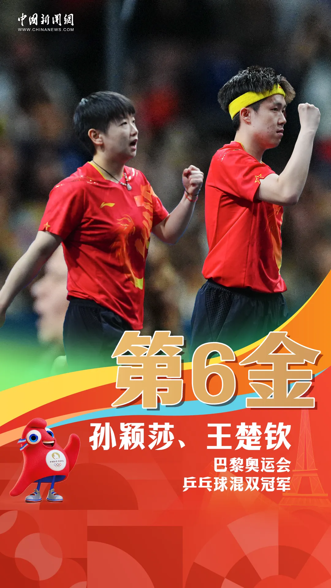 这是中国体育代表团在巴黎奥运会中取得的第6枚金牌,也是中国乒乓球队在本届奥运会中获得的首枚金牌。自乒乓球混双上届成为奥运会正式比赛项目后,国乒首次摘得该项桂冠。