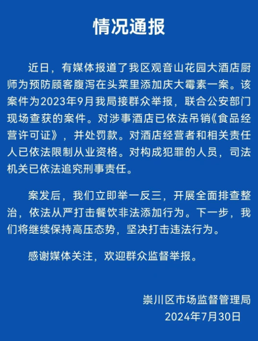 据“崇川市场监管”微信公众号消息,7月30日晚,崇川区市场监督管理局发布情况通报称,该案件为2023年9月崇川区市场监督管理局接群众举报,联合公安部门现场查获的案件。对涉事酒店已依法吊销《食品经营许可证》,并处罚款。对酒店经营者和相关责任人已依法限制从业资格。对构成犯罪的人员,司法机关已依法追究刑事责任。