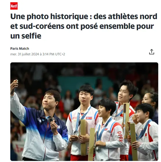 ▲ 法国周刊《巴黎竞赛》(Paris Match)以“历史性合影:朝韩运动员自拍合影”为标题进行报道。(媒体网站截图)