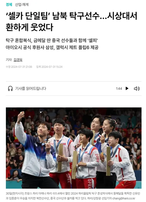 ▲ 韩国《韩民族日报》表示,朝韩两国乒乓球运动员在领奖台上微笑自拍。(媒体网站截图)