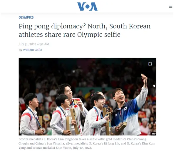 ▲ 美国之音(VOA)报道评价说,乒乓外交?朝韩两国运动员罕见奥运自拍合影。(媒体网站截图)