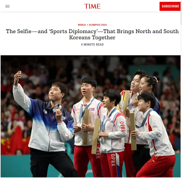 ▲ 美国《时代周刊》则称,自拍和 “体育外交”--让朝韩两国走到了一起。(媒体网站截图)