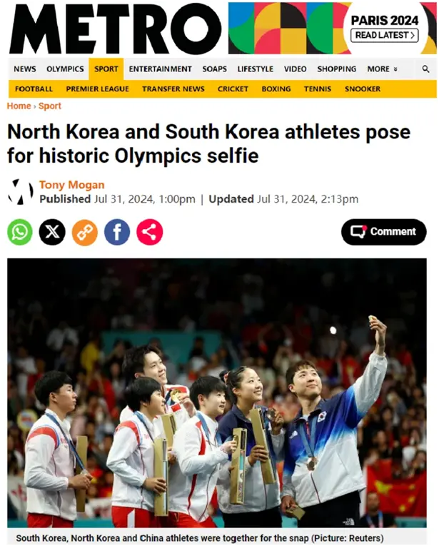 ▲ 英国《地铁报》报道称,朝韩两国运动员奥运会上历史性自拍合影时刻。(媒体网站截图)