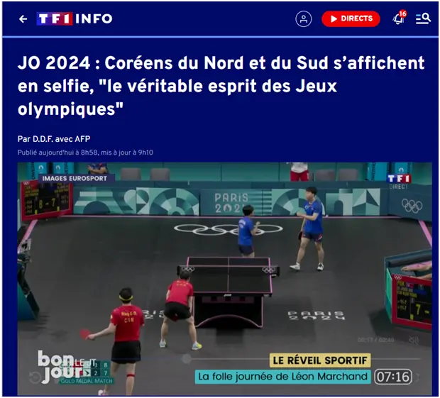 ▲ 法国电视一台(TFI)以“朝韩运动员自拍,’真正的奥运精神‘”为标题进行报道。(媒体网站截图)