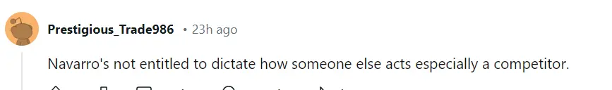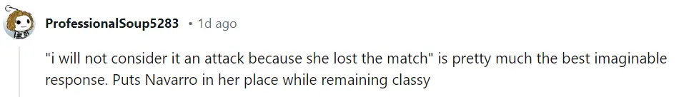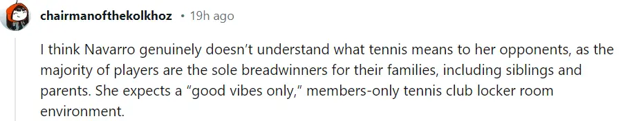 我认为纳瓦罗真的不明白网球对她的对手意味着什么,因为大多数球员都是家庭的唯一经济支柱。她希望有一个“只有好氛围”、会员才能进入的网球俱乐部更衣室环境。