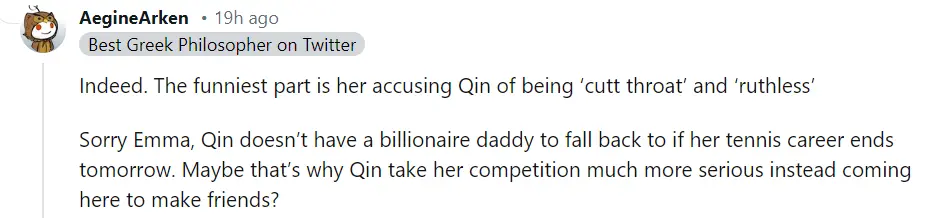 抱歉,艾玛,如果钦文的网球生涯明天结束,她没有亿万富翁爸爸可以依靠。也许这就是为什么钦文更认真地对待她的比赛而不是来这里交朋友。