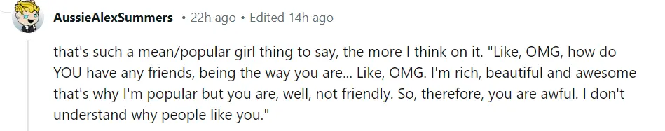 她破防是因为嫉妒吧,“天哪,你这样怎么会有这么多粉丝?。我有钱、漂亮、棒极了,所以我应该比你更受欢迎,并且你一点也不友好。我不明白为什么人们会喜欢你。”